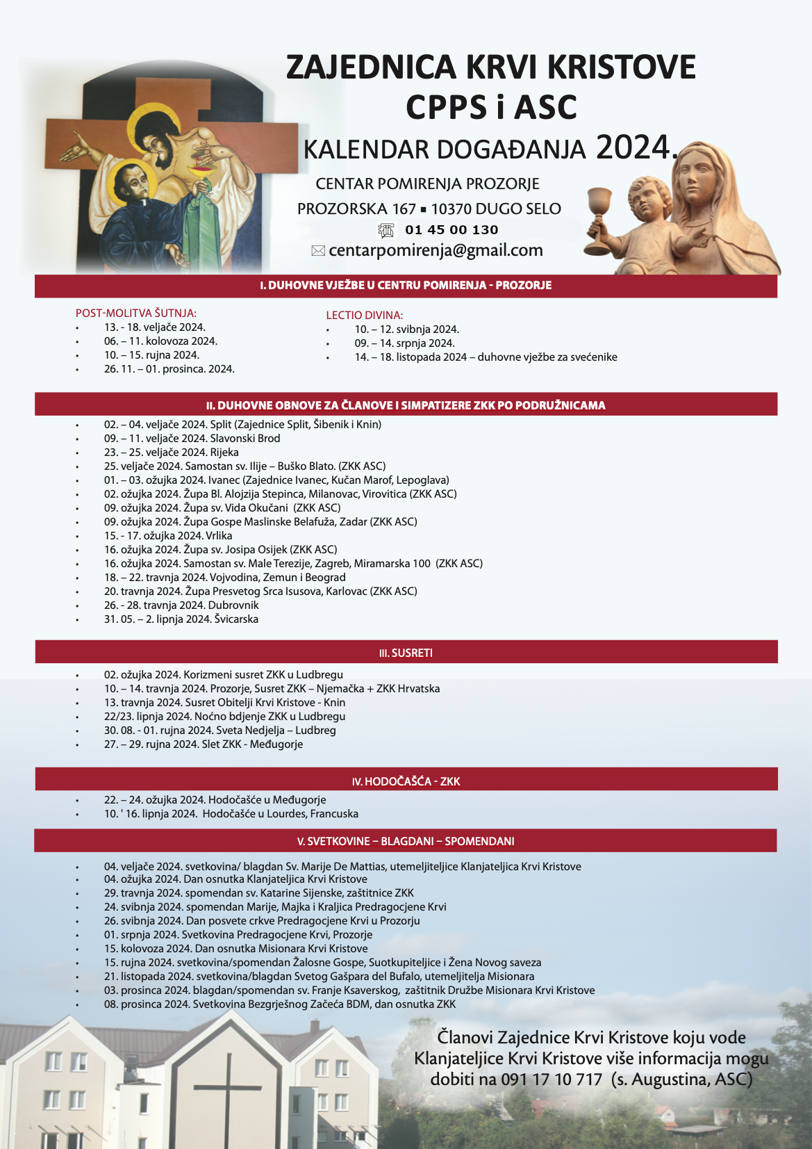 Događanja tijekom 2024. godine Na plakatu i u našem kalendaru na ovoj web stranici nalaze se sva događanja kronološki poredana tijekom 2024. godine za sve članove Zajednice Krvi Kristove i simpatizere.